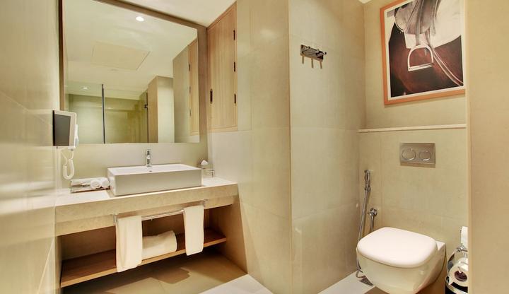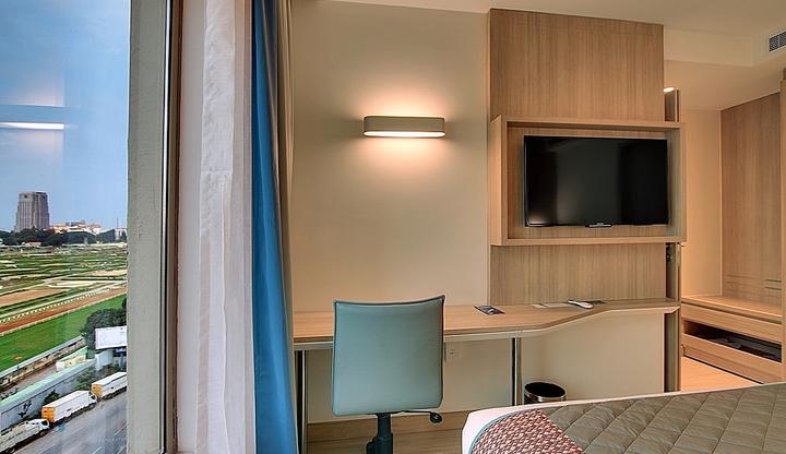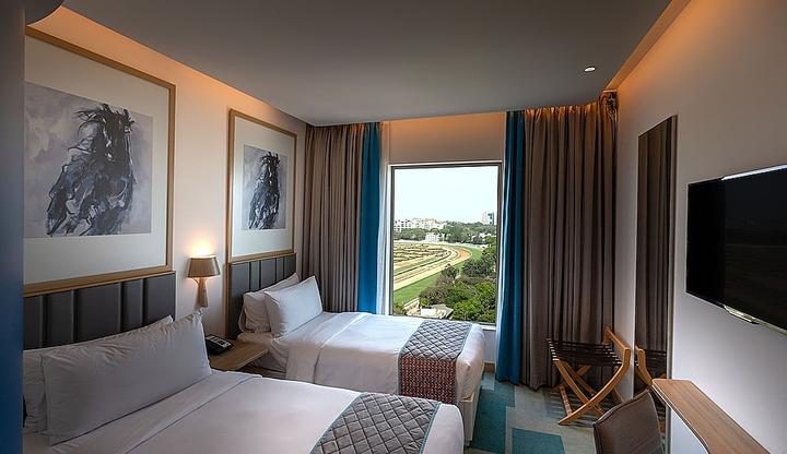 , with comfortable beds and a nice view of the racecourse. Housekeeping is efficient and the in-room facilities are satisfactory. Room service is prompt and efficient. The noise levels are low, ensuring a good night's sleep. The washrooms are clean and well-stocked with supplies. Overall, the rooms offer a comfortable and enjoyable stay.